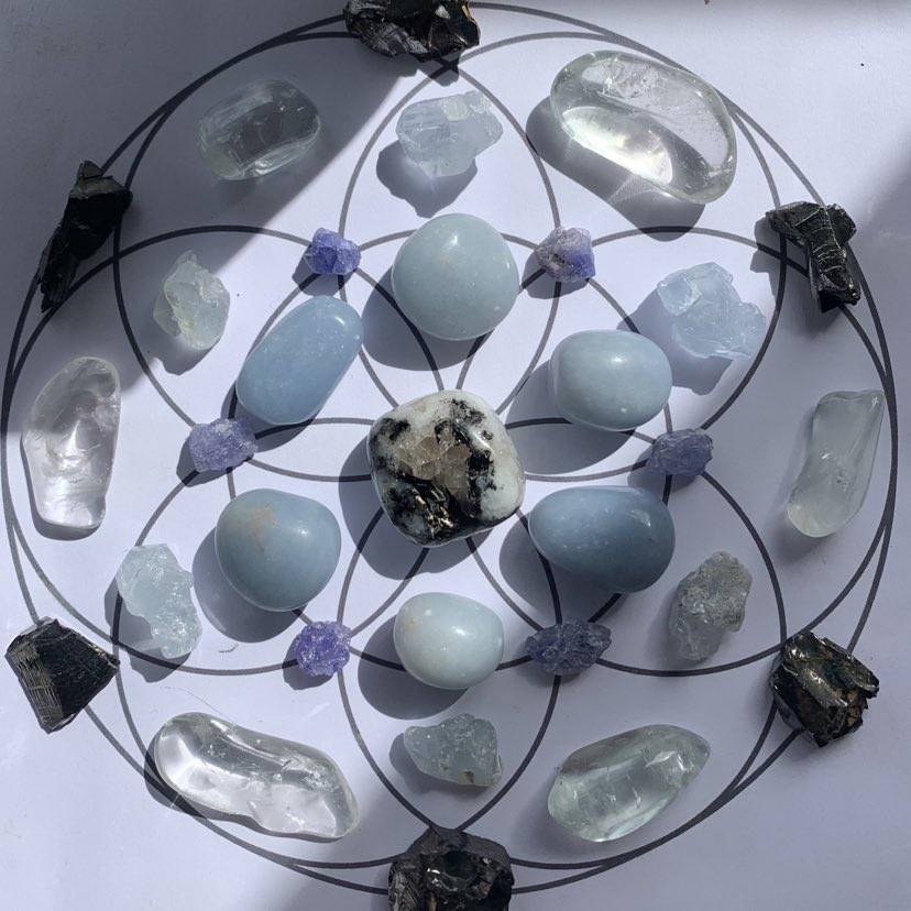 Begin by placing the Rainbow Moonstone at the centre of your grid. Surround it with Angelite and Tanzanite, forming a circle that embraces and amplifies the Moonstone’s properties. Position Celestite as the intention stone, close but just outside the circle, with Prasiolite marking the perimeter. Shungite stones can be distributed around the outermost area to complete the grid.