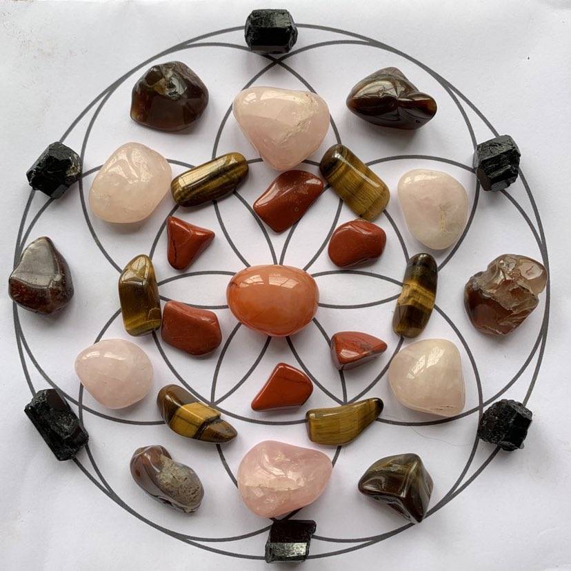 This Aries-inspired crystal grid setup is designed to empower you during the New Moon and solar eclipse, giving you the courage to initiate change, pursue your ambitions, and protect your journey towards personal mastery. Let this grid be your ally as you step into this vigorous season of new beginnings. Adjust the grid as you see fit, following your intuition and the specific energies you feel called to engage with. Embrace this powerful time to set intentions that light up your path forward.
